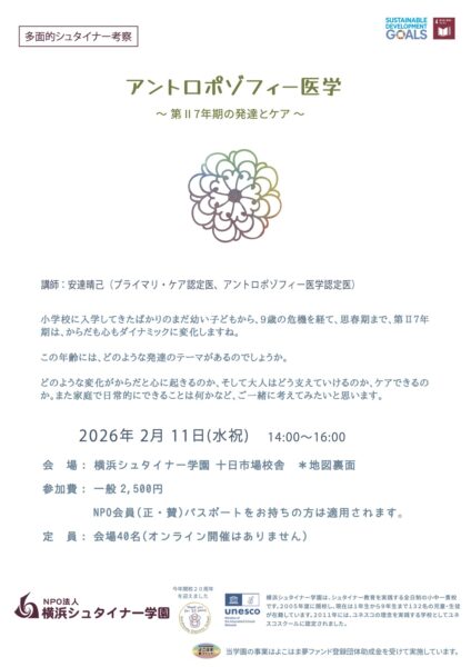【受付中】2/11(水祝) アントロポゾフィー医学 ~第Ⅱ7年期の発達とケア~